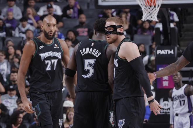森林狼:愛(ài)德華茲、蘭德?tīng)?、戈貝爾、麥克丹尼爾斯、迪文琴?/p>