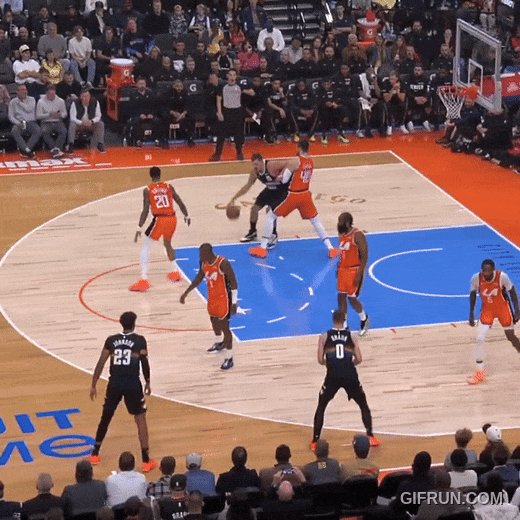 面筐試探步,投籃假動(dòng)作,晃跳后突破,尤班克斯防他左手上籃,約基奇跨兩步讓過(guò),打板。