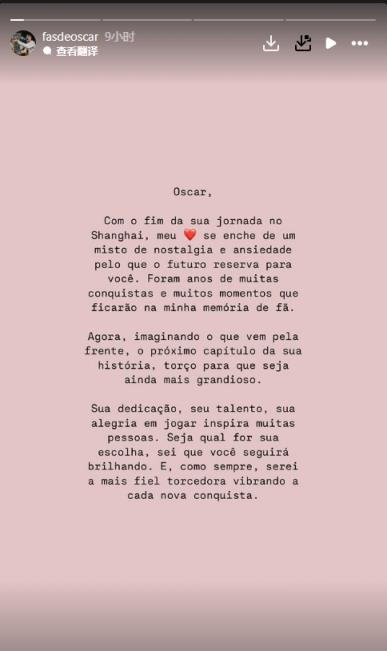 12月20日訊 奧斯卡的國外球迷團體在社媒發(fā)告別信,稱奧斯卡在中國的旅途即將結束。